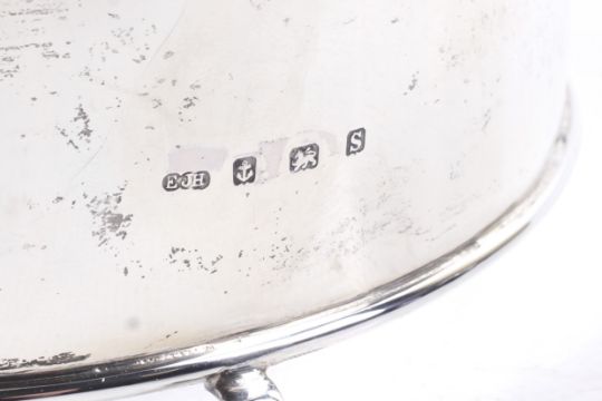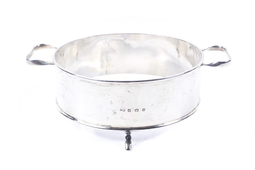 A silver round dish stand. With two scroll handles and four pad feet, mark of Edward Joseph Houlston (E J Houlston Ltd), Birmingham 1942, 17cm diameter (6 3/4 inches), 241g (7 3/4 ozs)