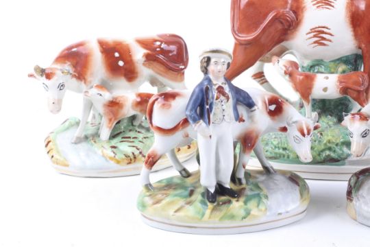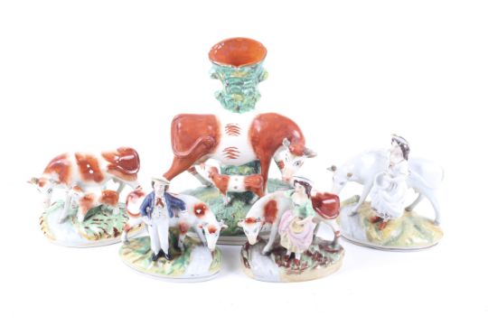 Five 19th century Staffordshire cow figures. Comprising of a vase featuring a cow milking her calf, H28cm, a pair of figure groups, H15cm, a milkmaid and cow, H17cm and a cow and her calf, H13cm