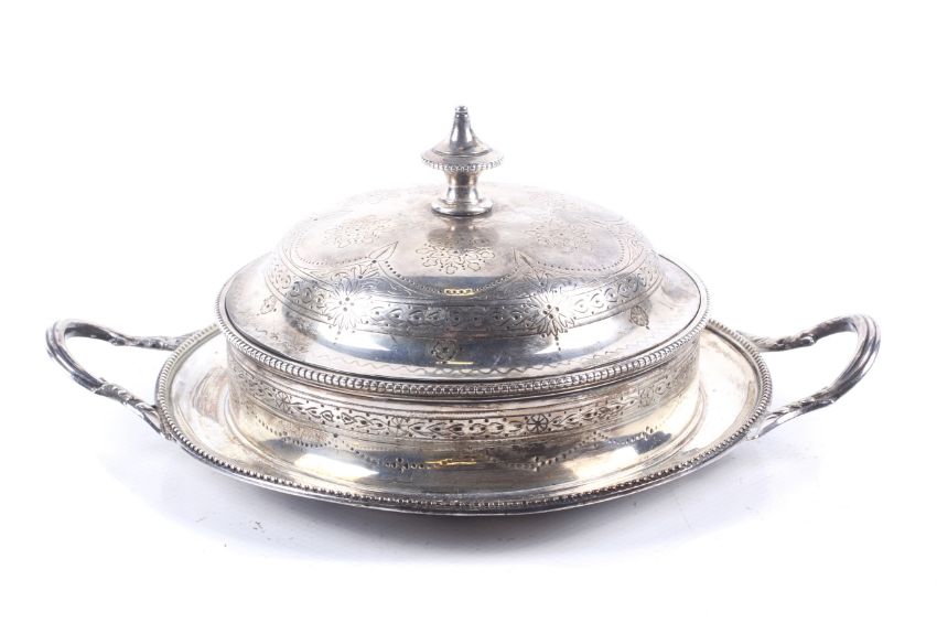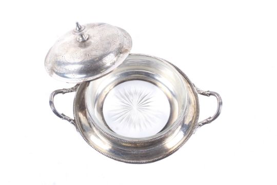 A Victorian silver round butter dish and cover. With a star-cut clear-glass dish, the base with beaded borders, two leaf-chased handles and an engraved band, the domed cover with a beaded knop and engraved with florets within lobed and leaf engraved panels, mark of Henry Wilkinson & Co., Sheffield 1868, approx. 9cm high overall, 17cm diameter (3 1/2 x 6 3/4 inches), 362g (a little over 11 1/2 ozs)