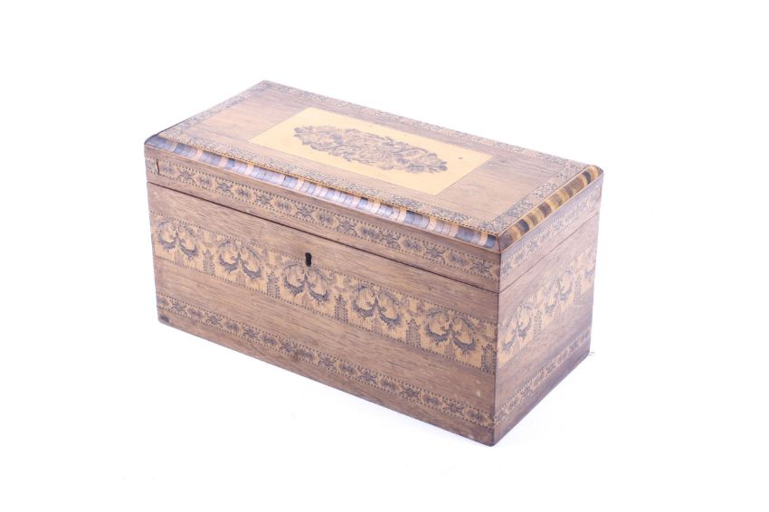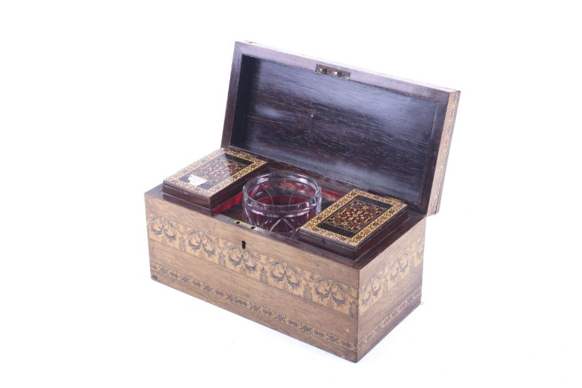 A 19th century Tunbridge Ware and rosewood tea caddy. The sides decorated with three floral and geometric bands, the top with a floral micro-mosaic panel surrounded by two borders. The hinged lid opening to reveal a glass mixing bowl flanked by two caddies, each caddy with floral micro-mosaics to the lids and lined in paper, with the original key, H15.3cm x W29.2cm x D14.2cm