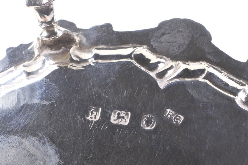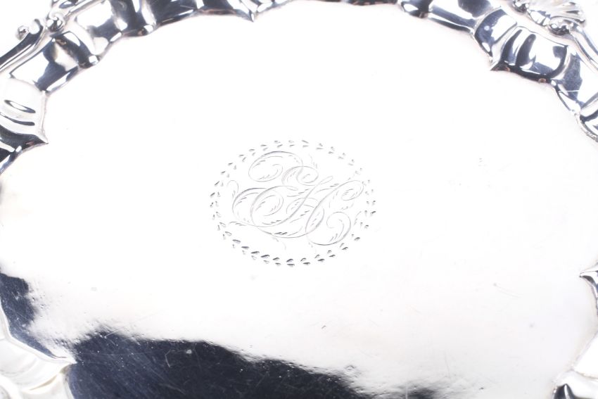 A George III silver shaped-round waiter. Engraved at the centre with a foliate script monogram, with a shell and scroll border and three hoof feet, mark of Ebenezer Coker, London 1765, 17.5cm diameter (6 7/8ths inches), 205g (a little over 6 1/2 ozs)