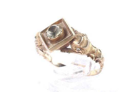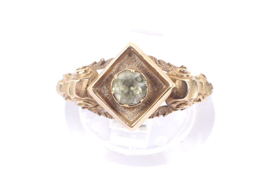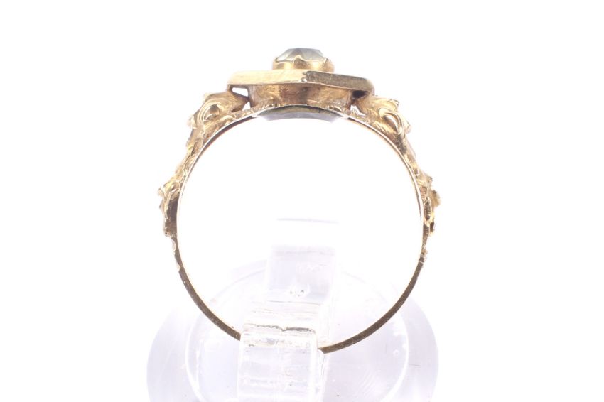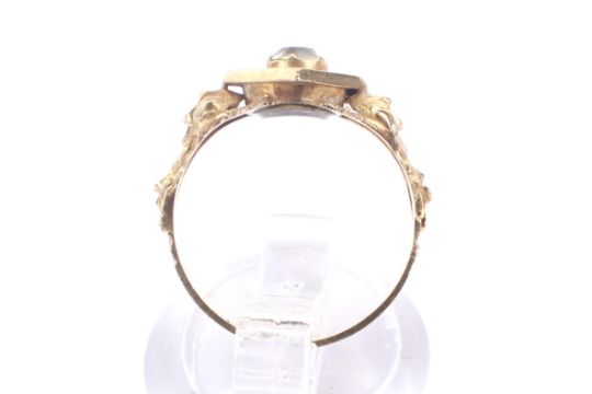 A late Victorian gold and chrysolite single stone locket-back ring. The small round pale-green stone rub-over set within a lozenge-shaped surround, the head with a woven-hair glazed locket back, between chased shoulders on an unmarked D-section shank, size about J, 1.4g gross