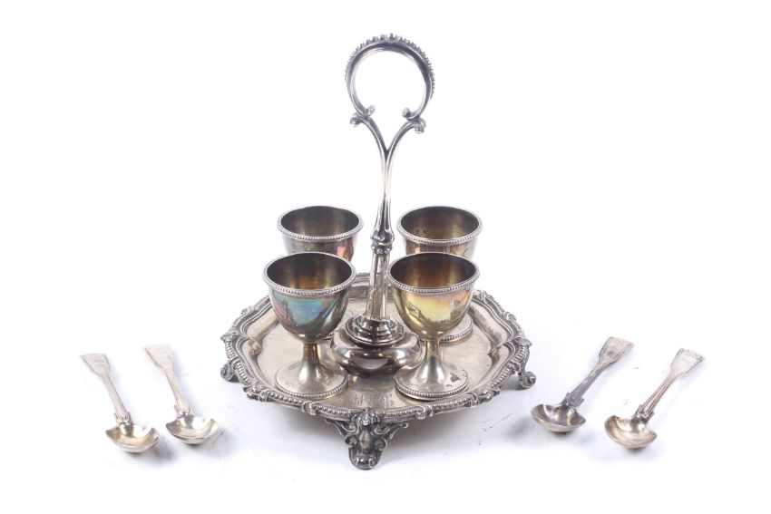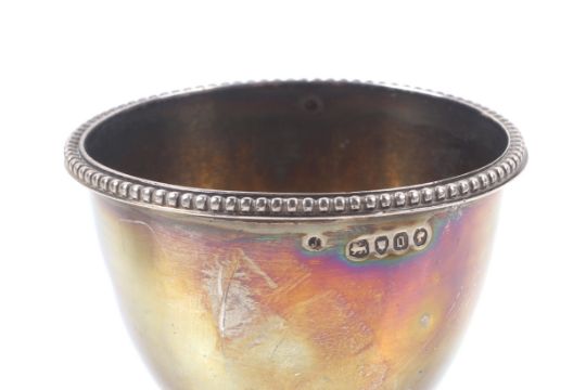 The handle no longer attraches to the base. Generally the metal is tarnished, there are small dents to the cups and the gilding is rubbed inside.