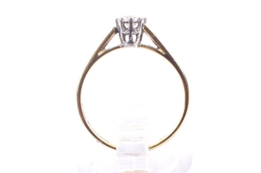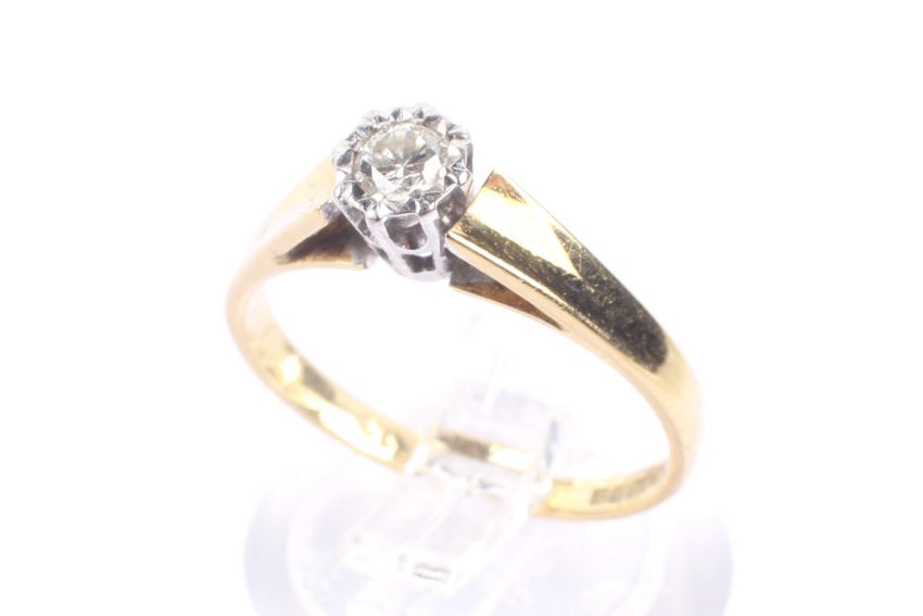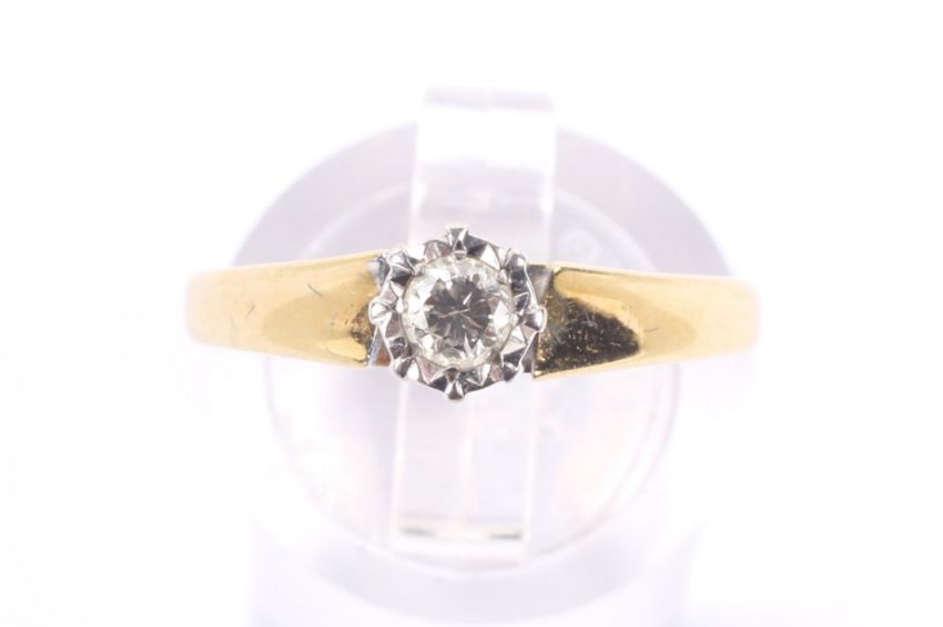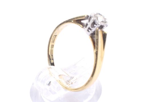 A vintage 18ct gold and diamond solitaire illusion ring. The round brilliat approx. 0.10cts grain-set within a white star-shaped surround on yellow D-section shank with hallmarks for Birmingham 1981, size M, 2.8g gross.