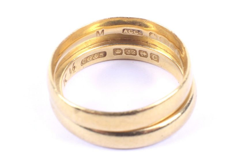 Two vintage 22ct gold wedding bands. One with indistinct hallmarks probably Birmingham circa 1930, 3.8mm wide, size about M, 3.1g; the other with hallmarks for Birmingham 1927, 3.1mm wide, size K, 5g