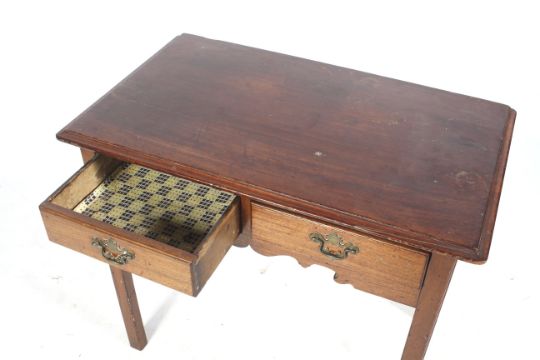An 18th century Georgian mahogany two-drawer side table. With front to back linings and champfered squared legs, H73cm x W86cm x D50.8cm