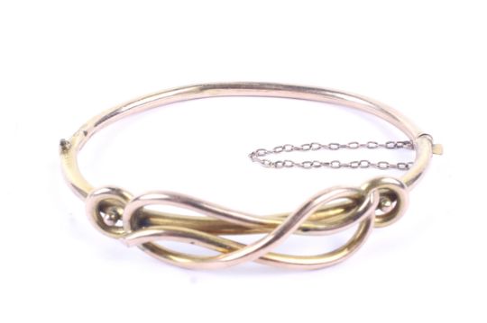 A late Victorian 9ct rose gold hollow knot bangle. The front designed as an open work 'Lover's knot' on a hinged back, hallmarks for Birmingham 1898, 6.8g