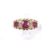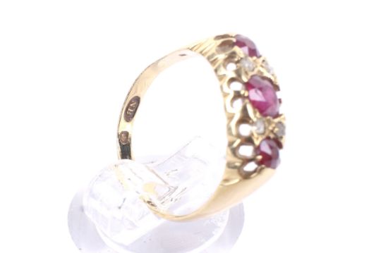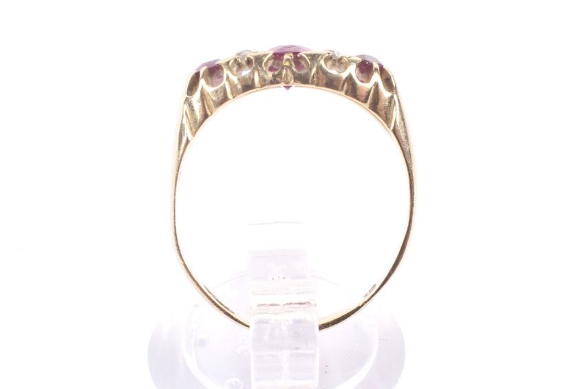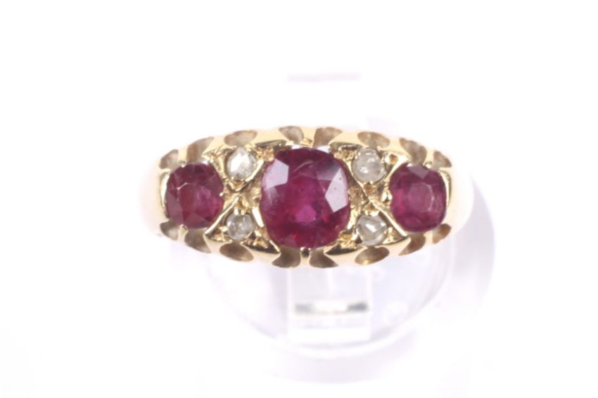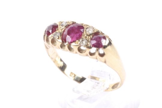 An Edwardian gold, ruby and diamond dress ring. The three graduated oval and cushion-shaped mixed-cut rubies spaced by pairs of small rose diamonds, on a D-section shank with partial hallmarks, size O, 3g gross
