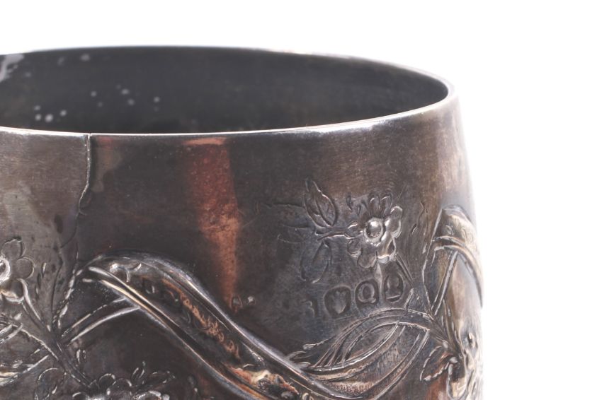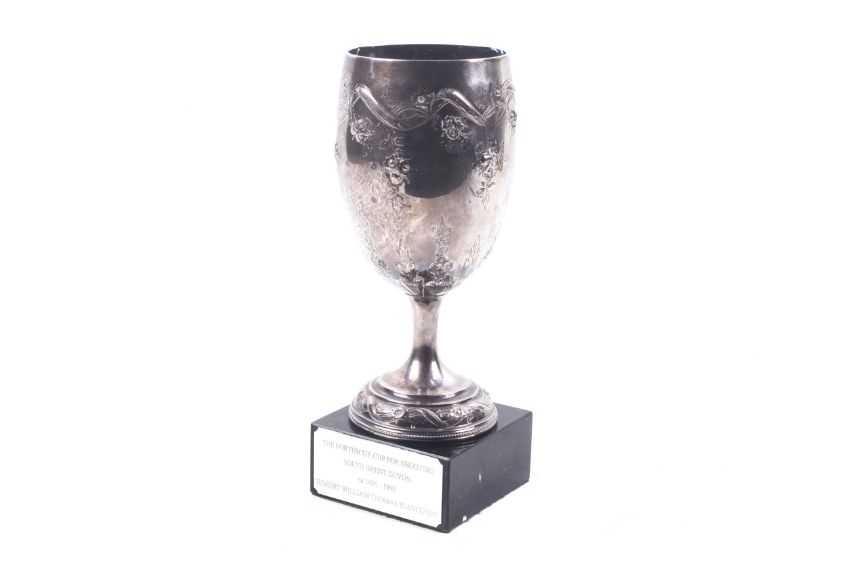 A George III silver cup. Embossed with drapery swags and flower and leaf pendants, the maker's mark rubbed, London 1810, 20cm high overall (8 inches), approx. 281g gross including the later glued in pedestal screw); on a later black hardstone plinth with an applied 'Shooting Cup' panel