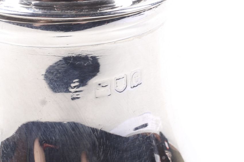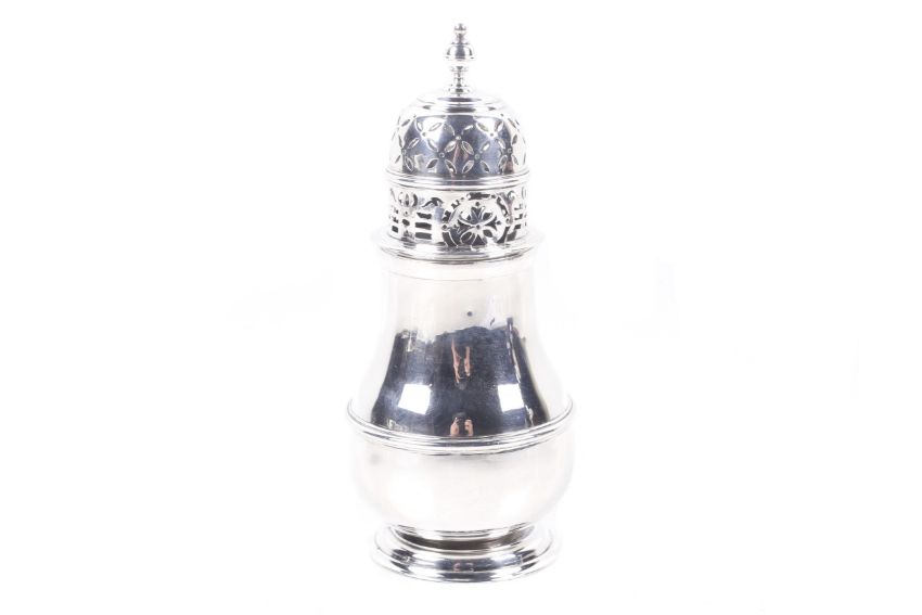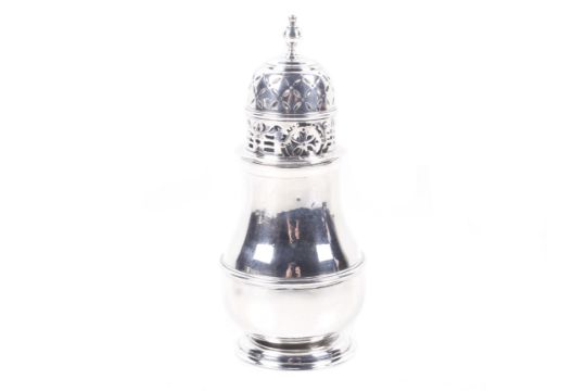 A late Victorian silver baluster-shaped sugar caster in George II style. With a pierced domed cover with a vase finial, a central moulded band on a stepped-round foot, mark of Charles Stuart Harris, London 1900, 16.5cm high overall (6 1/2 inches), 204g (a little over 6 1/2 ozs)