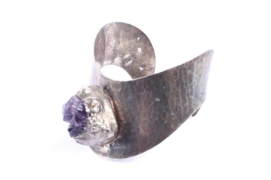 Jacob Hull for Buch + Deichmann, Danish, a vintage amethyst 'brutalist' torque bangle, circa 1970s/80s. The front mounted in a sculptural manner with a purple amethyst matrix on a 'rocky' support to a hammered white metal tapering bangle, stamped 'J Hull', 'Denmark'