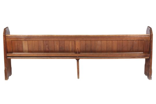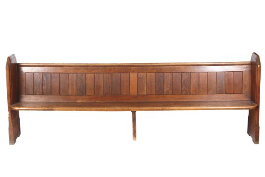 An early 20th century oak church pew. With panelled back and chamfered ends, one with carved decoration, on bracket supports, H91cm x W258cm x D38cm