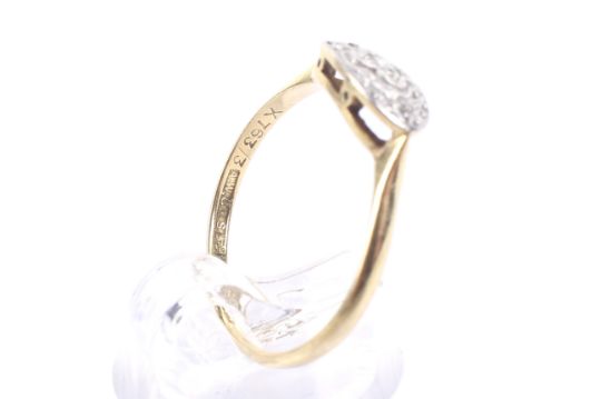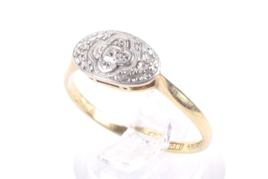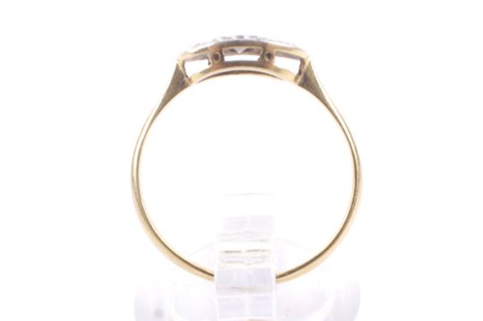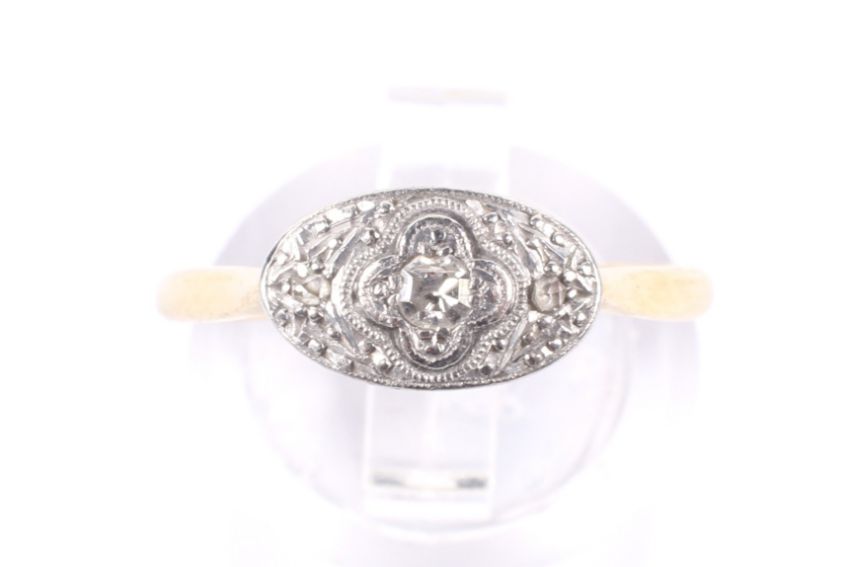 An early 20th century gold and diamond three stone oval ring, circa 1925. The platinum-flashed oval head grain set with a small eight-cut diamond flanked by two tiny rose cuts, on a thin D-section shank stamped '18ct & Pt', size O+, 2.1g