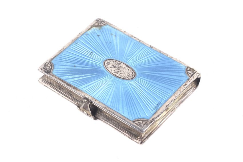 A chip to the enamell lower left corner not through to the base. Metal is tarnished, Makers mark is a little rubbed. Catch functions.