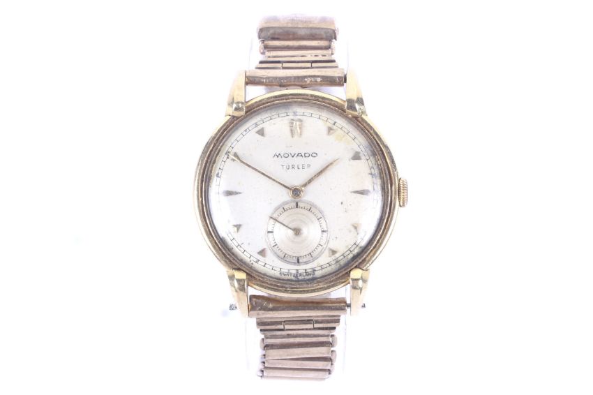 Movado, Turler, a gentleman's Swiss 18ct gold round wrist watch circa, 1950(?), The silvered dial with raised gilt triangular and arrow-head indicators, baton hands and a subsidiary seconds dial at 6, the 33mm diameter two-piece case with lobed lugs and with Swiss hallmarks and '18K' over '750', on an associated gold-plated 'ladder' bracelet, Movado Factories 15 jewel movement