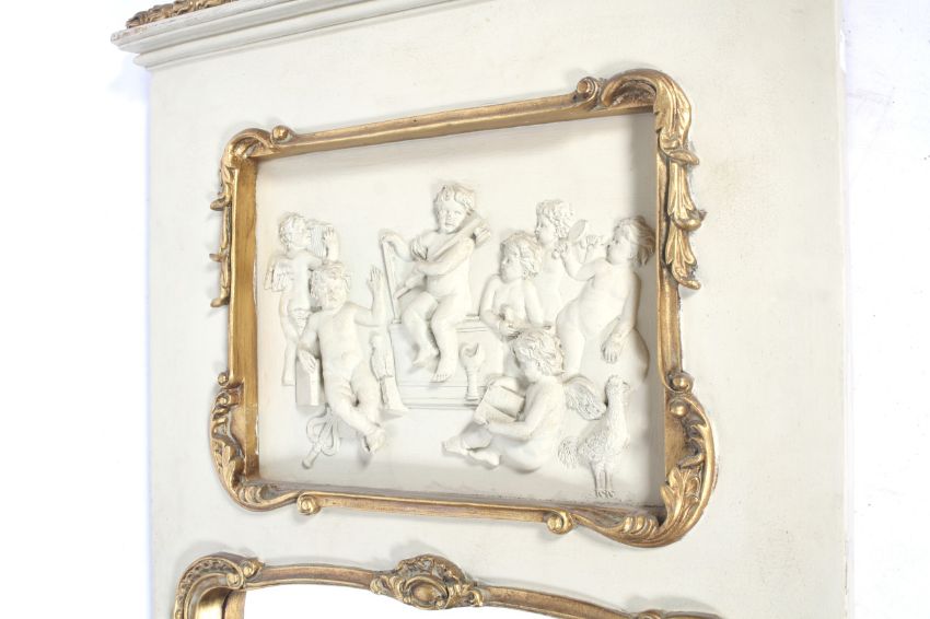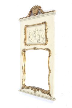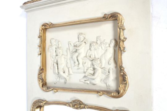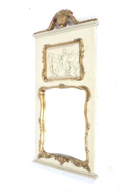 A 19th century wall mirror. Painted white with a gilt gesso finial featuring a basket of fruit and ribbons, inset with a frieze featuring multiple cherubs over the bevelled edge mirror, both bordered with gilt carvings, H138cm x W70cm