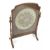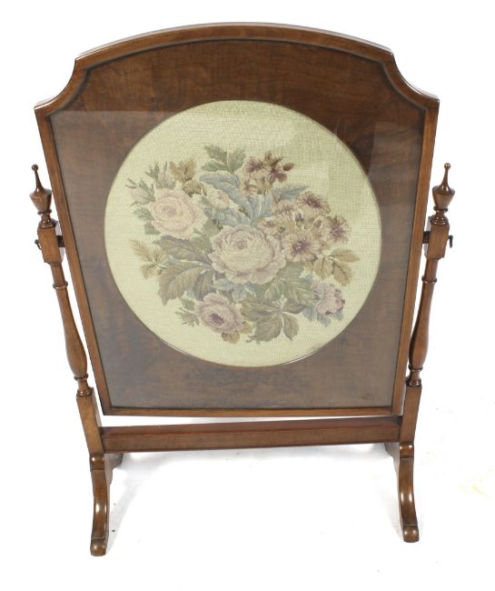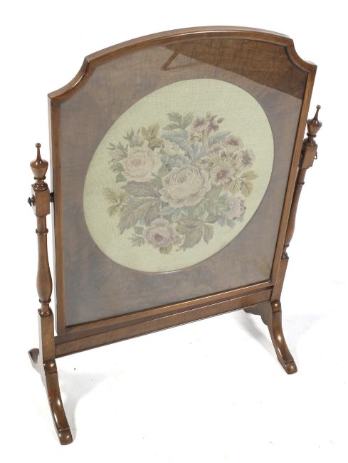 A mid-late 20th century walnut firescreen. With hinged and glazed floral needlework tondo to the centre, H97cm x W70cm x D30cm