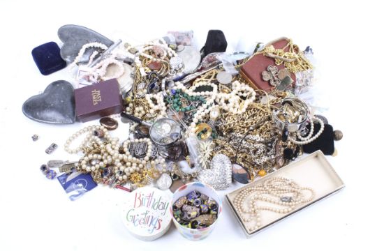 An assortment of costume jewellery. Including glass beads, gold plated chains, a string of imitation pearls, a small selection of Georgian and later coins, a white metal ring, enamel pin badges and more