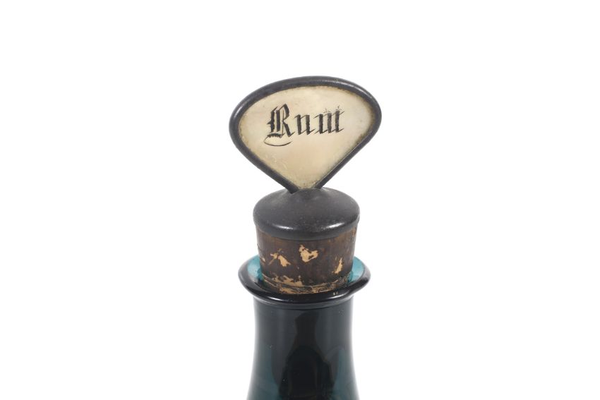 A 19th century green glass 'rum' bottle. Modelled as a decanter, with a wine label and chain painted onto the exterior, the cork bearing a mother of pearl and metal topper marked 'Rum', H24cm