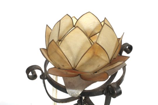 A late Victorian telescopic and wrought iron standard lamp base. With scroll and twist metalwork decoration and copper ball weight to the base. H124cm
