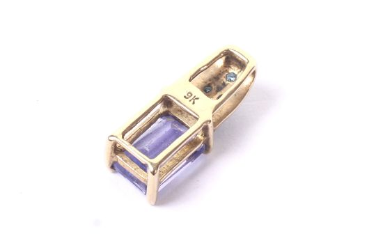 A vintage tanzanite and diamond pendant. The rectangular step-cut tanzanite claw set below five tiny irradiated-blue diamonds, stamped '9k', 15mm high overall, 1g gross; together with a certificate of authenticity