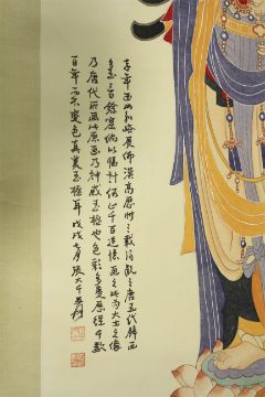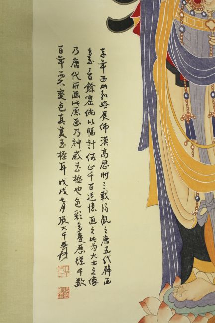 A hand coloured copy of a famous picture of a Guanyin by Zhang Daqian. With four line inscription and two seals lower left. Paper H128cm x W65.5cm, mounted on silk.