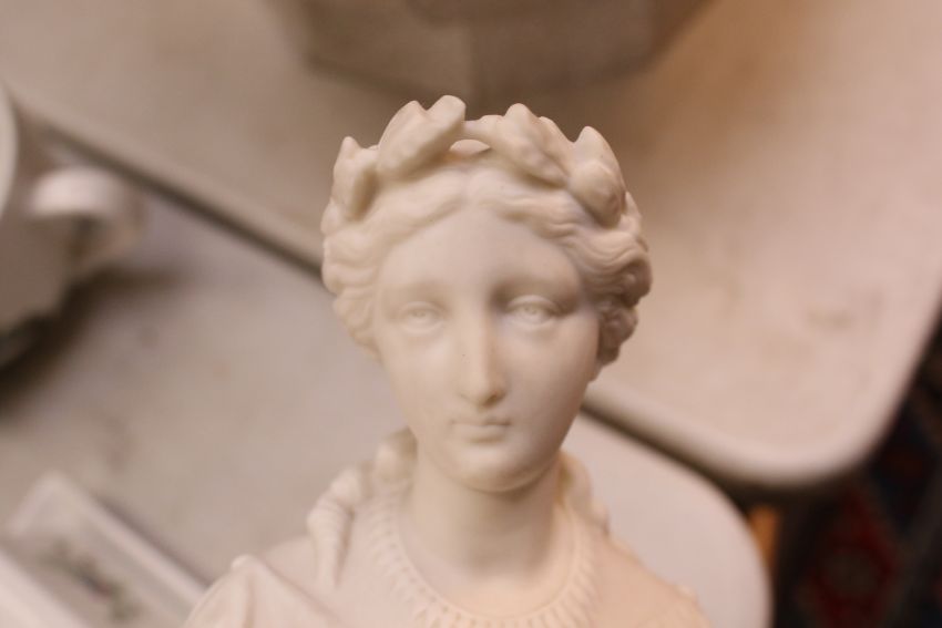 Two 19th century Parian ware figures. Comprising a Copeland figure of 'Sappho', modelled by W. Theed as a Grecian beauty holding a turtle-back lyre, impressed marks. H43cm and a Minton Parian group 'Naomi and her Daughters in Law' featuring a lady embracing two younger women, on a stepped base, H33.5cm