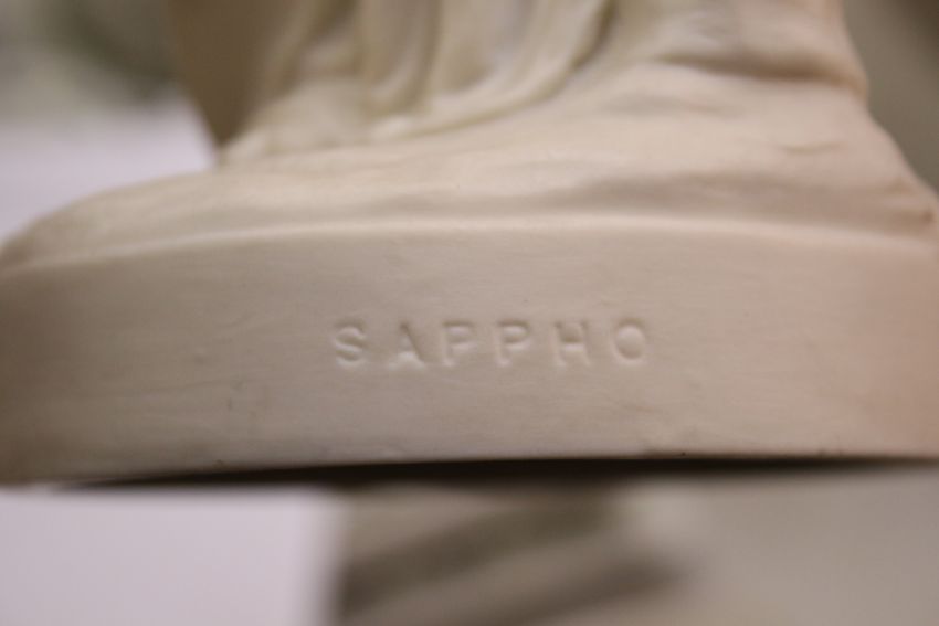 Sappho - has lost the end of the instrument in her right hand and the top of the left hand arm of her lyre. Free from restoration. Naomi - has had the fingers of her right hand glued back. Standing daughter has lost her right hand. There is damage to the jug at the side of the seated figure.