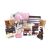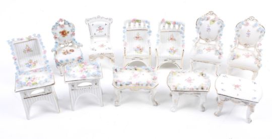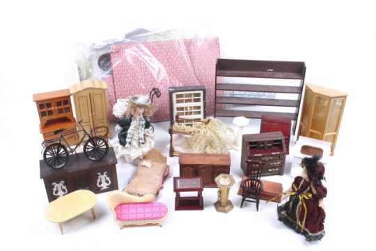 An assortment of dolls house furniture. Including porcelain table and chairs with floral decoration, a wooden desk, four poster bed and more. Max. H20cm