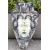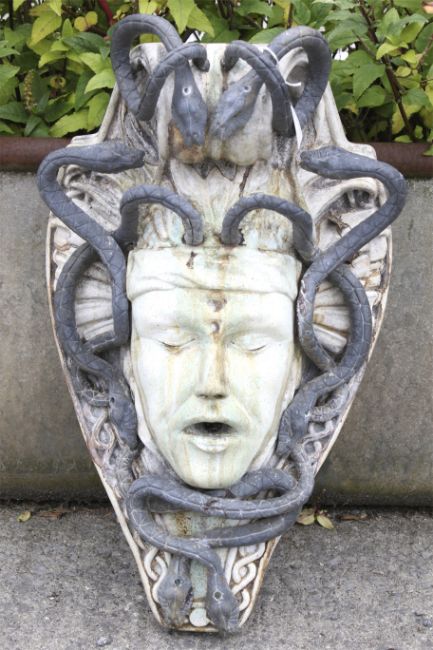A weathered wall hanging fountain head mask depicting Medusa. With metal snakes in her hair. On a shield-shaped back, approx. 53cm high overall