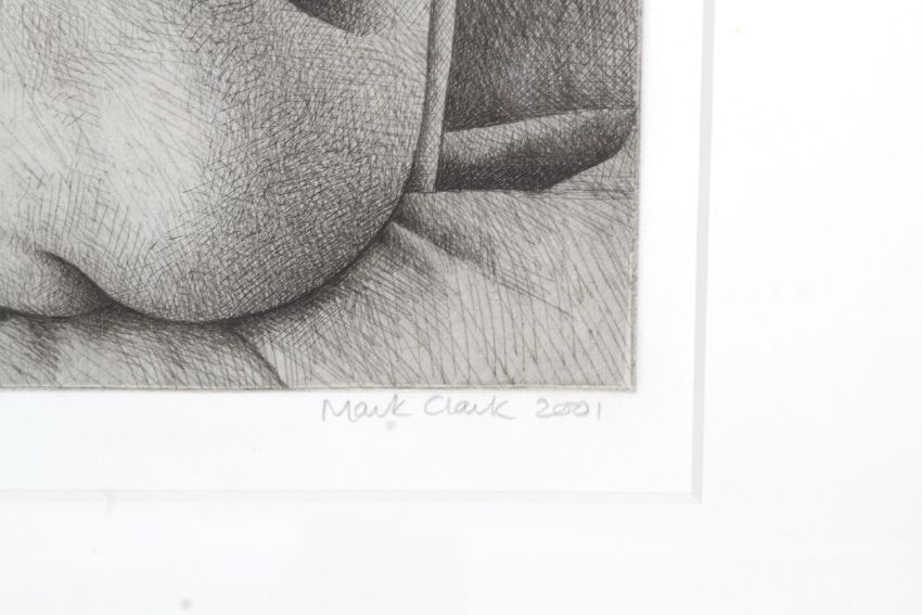 Two Mark Clark (1959) signed etching prints - nude study. Including A/P dated 2001, framed and glazed 28cm x 40cm; no. 65/75 dated '00, framed and glazed 37cm x 58cm.