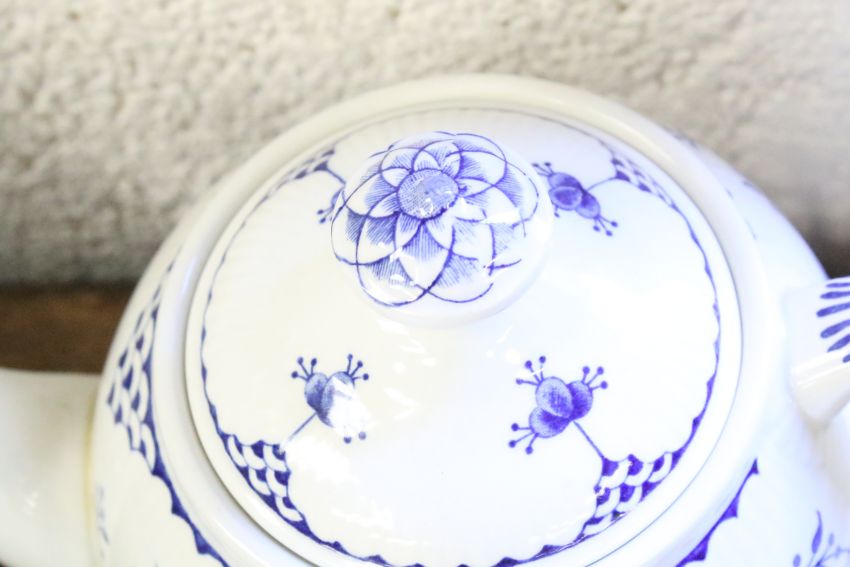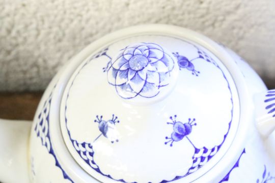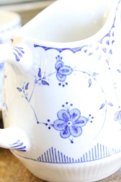 A vintage blue and white 'Denmark' dinner and tea service. Various manufacturers including Mason's, Furnivals Ltd., Johnson Bros. and Ridgway; consisting of 6x 17cm cereal bowls; 3x 22.5cm bowls; 6x tea cups 9.5cm diameter, etc.