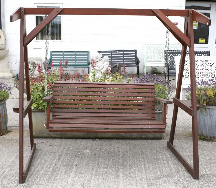 A garden swinging chair. Constructed of stained wood with metal chains, missing screws and nuts. H173cm x W188cm x D105cm