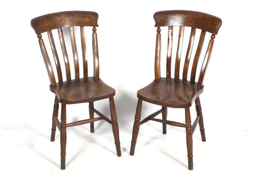 A pair of early 20th century slate back Windsor chairs. With turned tapering supports united by a stretcher. H93cm