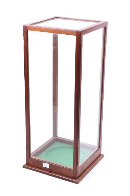 A mahogany and glass display case. L21cm x D21cm x H52cm