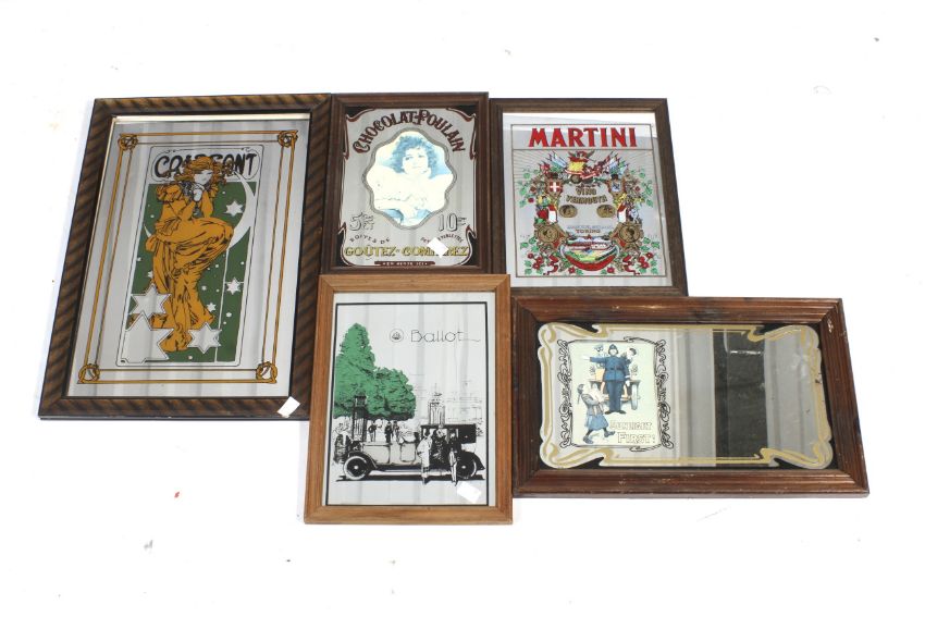 Five vintage advertising mirrors. Including 'Chocolat Poulain', 27cm x 19cm, 'Martini', 30cm x 22cm, all framed and glazed