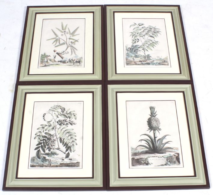 A set of four antique hand coloured botanical engravings. Including 'Thamarindus', 'Ananas' and 'Acacia Major', etc. Framed and glazed, 'Julia Boston Antiques' label verso. 22.5cm x 33.5cm