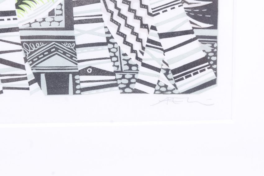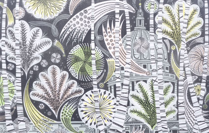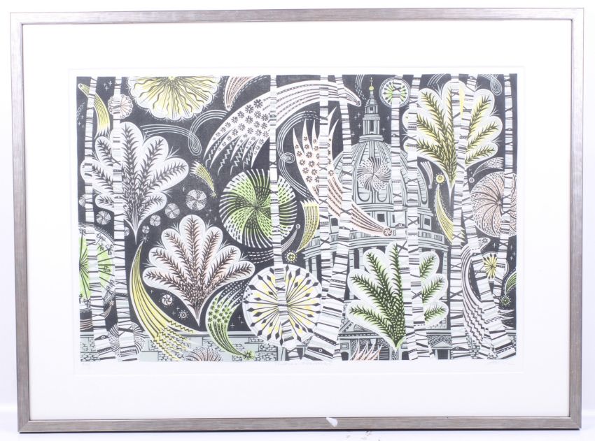 Angie Lewin (1963) 'Thames Fireworks'. Signed limited edition print, no. 15/60. Framed and glazed. 59cm x 41cm