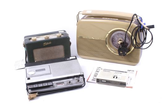A vintage tape player and three radios. Comprising a Bush radio, a Roberts model R200 radio, a Hi-Bunsonic AM-FM clock radio and a Philips cassette recorder N2205