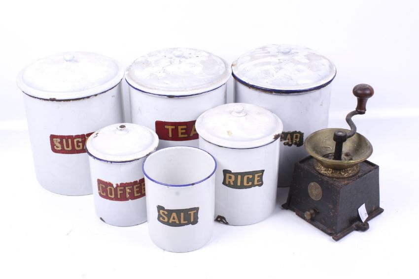 A collection of six assorted vintage enamel storage jars. Including 'Tea, Coffee, Sugar, Salt and Rice' plus an Archibald Kendrick & Sons Ltd coffee grinder. Max. H20cm. (7).