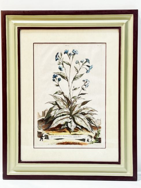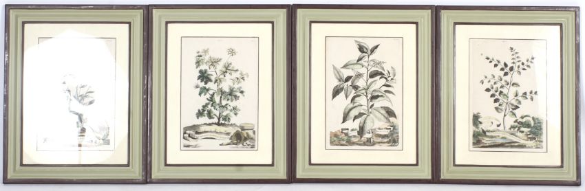 A set of four antique hand coloured botanical engravings. Including 'Blitum Americanum', 'Pulmonaria' and 'Geranium', etc. Framed and glazed, 'Julia Boston Antiques' label verso. 22.5cm x 33.5cm