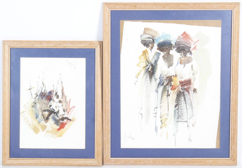 Two Wallace Hulley (born 1931, South Africa), two watercolours. One depicting two mules, 36cm x 25.5cm, the other of three women, 51cm x 39cm, both framed and glazed***This lot is being sold on behalf of Golden Oldies Charity***