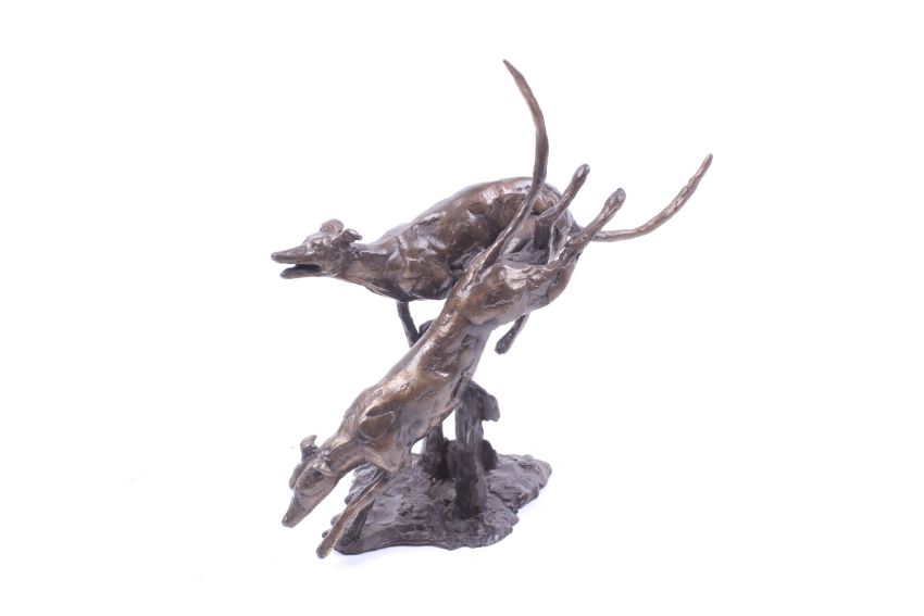 A contemporary bronze greyhound figure group. Of a pair of greyhounds jumping a fence. H21cm