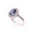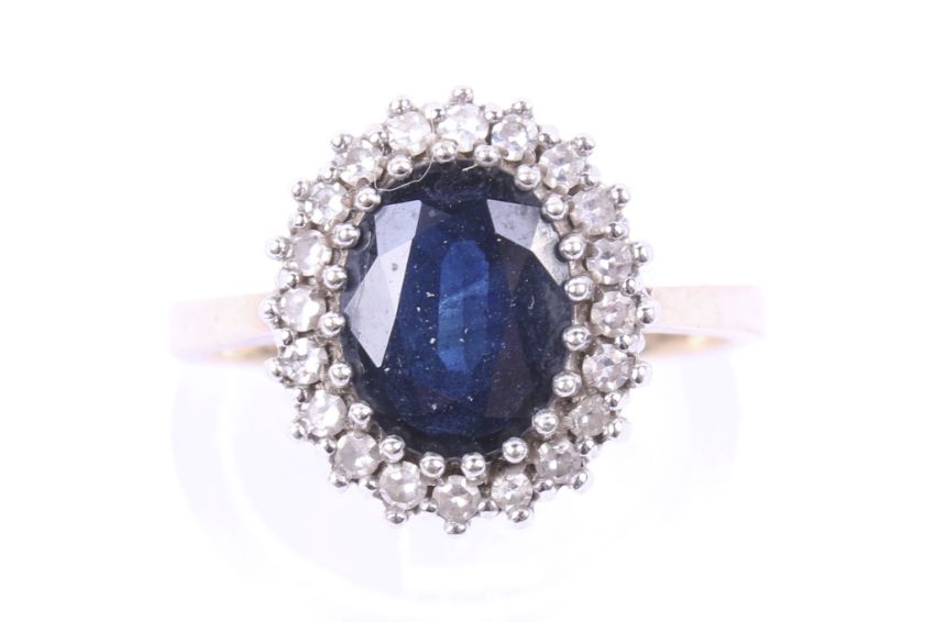 A vintage 9ct gold, sapphire and diamond oval cluster ring. Centred with an oval mixed-cut very-dark-blue sapphire within a small eight-cut diamond 20 stone border, all claw set in white on a yellow D-section shank with knife-edge shoulders, hallmarks for London 1988, size L, 3.8g gross