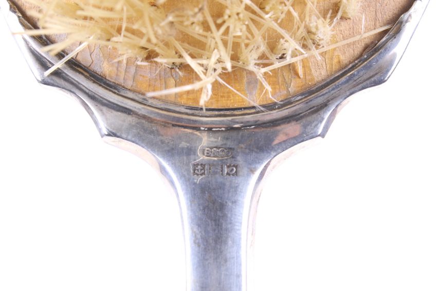 A silver mounted composite six piece dressing table set. Comprising a tortoiseshell pique mounted round hand mirror, hallmarks for Birmingham 1926; an engine turned shaped-oval hand mirror and hair brush; an oblong clothes brush with shaped terminals, and a comb mount only, all Birmingham 1963; and a silver mounted small travel comb in a silver engine turned case, Chester 1930