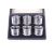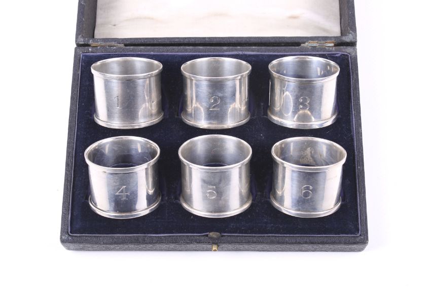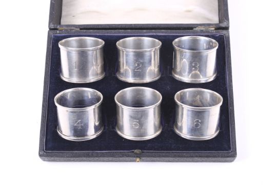 A set of silver napkin rings and a cruet set. The set of six silver napkin rings each with an initial 'H' and numbered 1-6, hallmarks for Birmingham 1918, 131g, in a fitted case; silver five piece cruet set, comprising two cylindrical pepper pots with pierced domed covers, two oval open salts with blue glass liners, and an oval mustard pot with a shell-shaped thumb-piece, angular scroll handle and each on bun feet, hallmarks for J C Vickery, Chester 1921, with a silver mustard spoon and two plated salt spoons, approx. 136g of weighable silver, in a fitted case