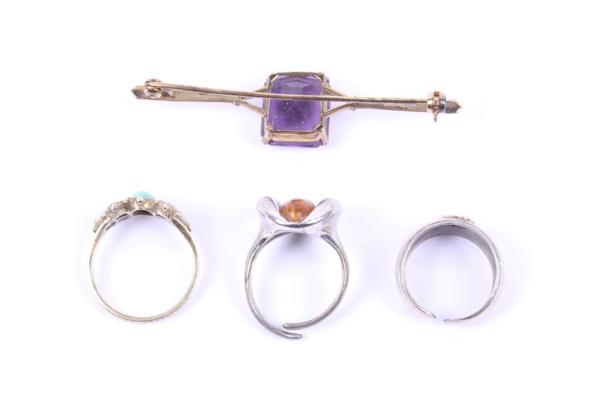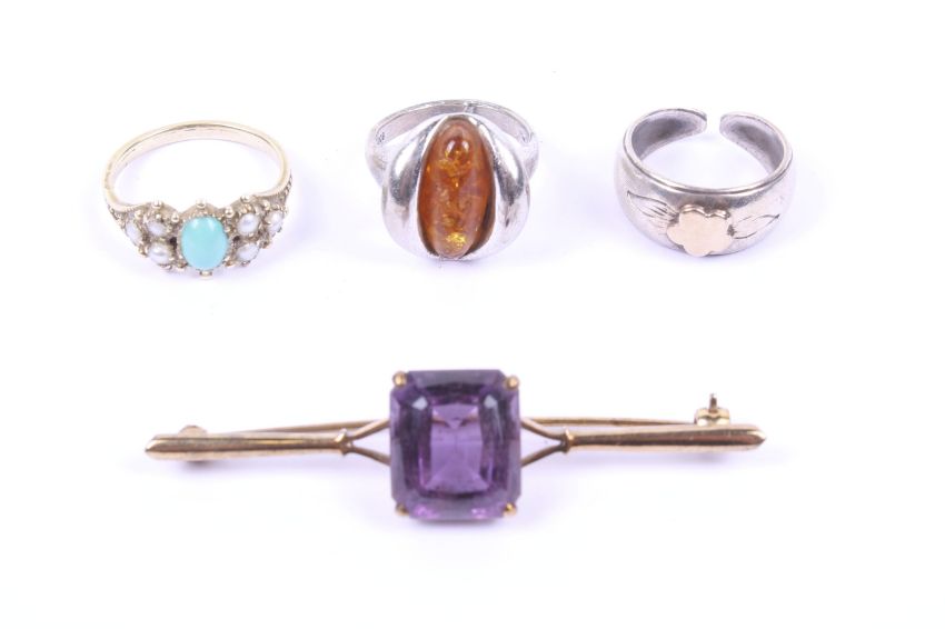 A small collection of jewellery including a turquoise and half-pearl dress ring. A Baltic amber .835 standard oval single stone ring; a tapering band ring with a gilt floret stamped '925' & '750'; and a rectangular amethyst single stone bar brooch, stamped '9ct'