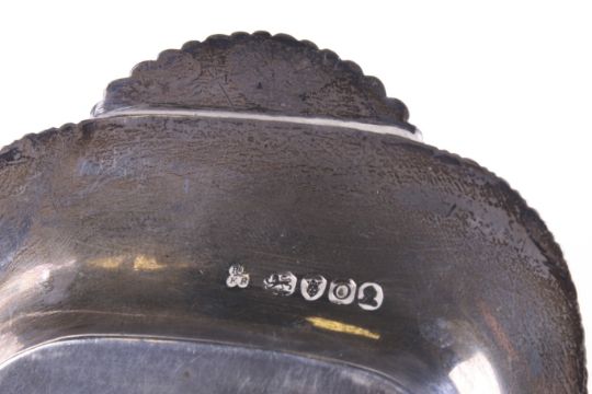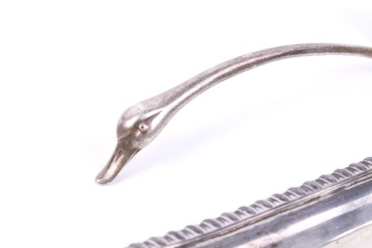 A George III silver oblong snuffers tray and a bird's head sauce ladle. The snuffers tray with a gadrooned border and leaf and fan shaped terminals, mark of Emes and Barnard, London 1809, 26cm long (10 1/4 inches), 220g (a little over 7 ozs); together with a sauce ladle with a duck's head terminal and feather decorated handle/bowl back, mark of Sarah Jones, London 1989, approx. 14cm long (5 1/2 inches), 49g (a little over 1 1/2 ozs)