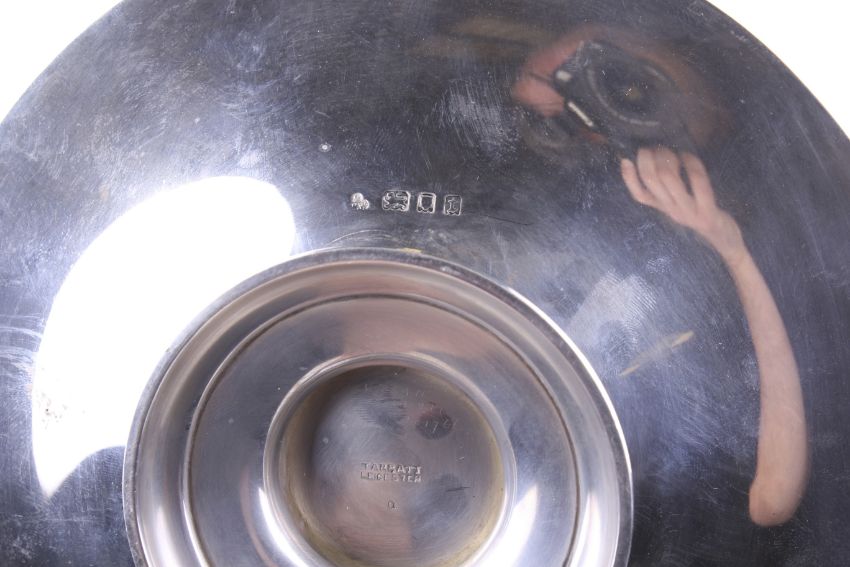 A silver tazza or cake stand on foot. With a Celtic knot and bosse border, marked beneath 'Tarratt Leicester', hallmarks for Wakeley & Wheeler, London 1934, 4cm high, 20cm diameter overall (1 5/8ths x 7 3/4 inches), 344g (11 ozs)