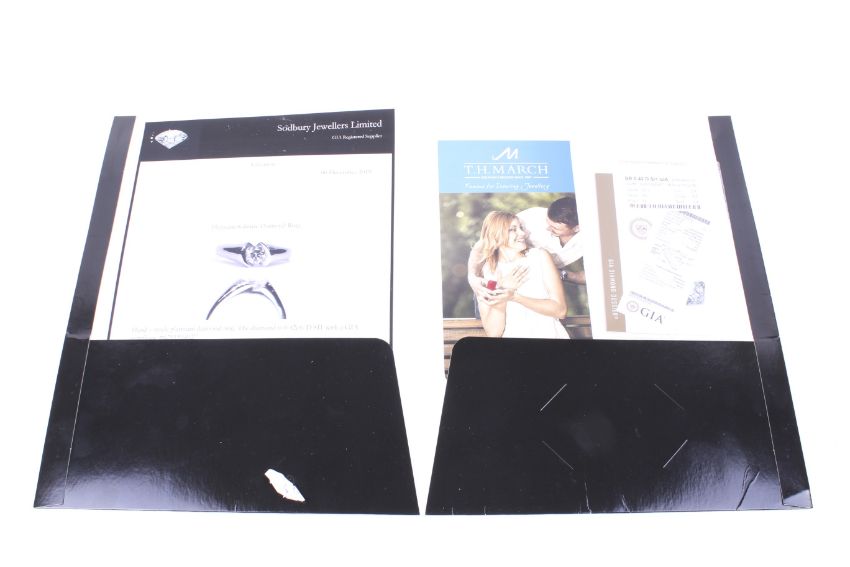 A diamond solitaire ring. The round brilliant on a GIA certificate stating the weight to be 0.42cts, colour; D, clarity; SI1, Cut Grade; Excellent; Polish; Excellent; Symmetry; Excellent, Fluorescence; None, the stone compression set in a mount with the maker's mark of Graham M Jones, and a 'Sodbury Jewellers Limited' Valuation stating 'Hand-made platinum ring...' £5,130.00, size K+, 7.4g gross; Sold with the original GIA certificate